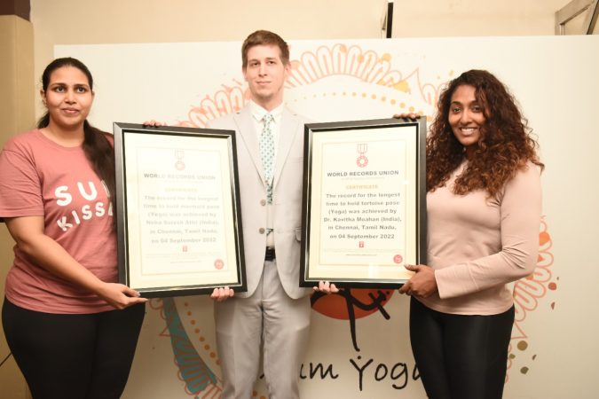 In the attempt to set a new world record Dr Kavitha Moahan held her contorted body in place for 01 hour and 08 minutes in the Tortoise pose (Kurmasana) whereas 32 year old Ms Neha Suresh Attri held her contorted body in place for 01 hour and 16 minutes in the Mermaid pose (Eka Pada Rajakapotasana) and the duo created a new world record.