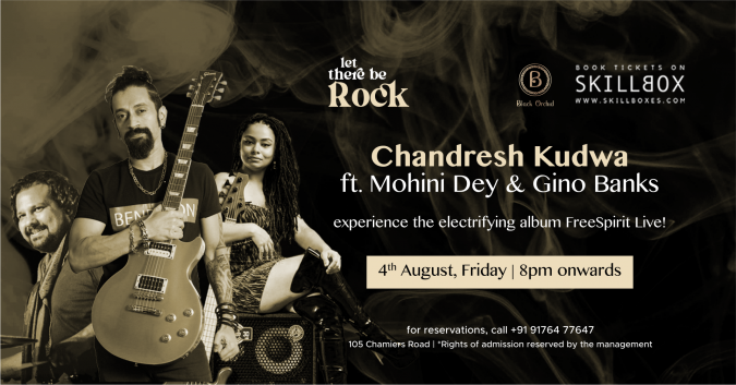 So, come down to Black Orchid and Experience high-wattage rock, live, with the phenomenal guitar player, Chandresh Kudwa alongside stellar bass player, Mohini Dey, and powerhouse drummer, Gino Banks, live and loud on 4th of August at RA Puram, Chennai.