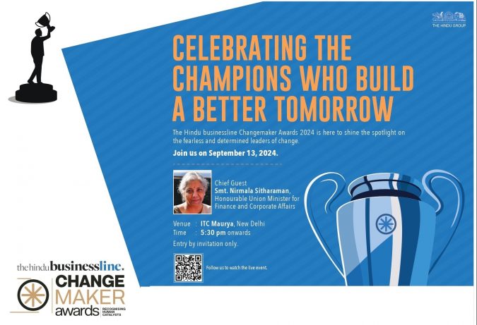 Chennai, September 10, 2024: The Hindu businessline Changemaker Awards 2024 will be announced on September 13, 2024, at ITC Maurya, New Delhi. The event will be from 5.30 pm onwards. Ms Nirmala Sitharaman, Honourable Union Minister for Finance and Corporate Affairs, will be the Chief Guest for this event and give away the awards. Entry for the event is by invitation only.