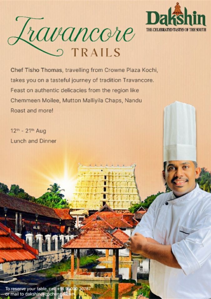 Travancore is known for its rich culinary trails and has been one among the most endowed regions in terms of natural resources. This August 2022 “Dakshin” celebrates the rich gastronomy ethnicities of the Travancore region. Chef Tisho Thomas, travelling from Crowne Plaza Kochi, will be pleased to take you on a refined culinary journey with a wonderful era of history of travancore region.