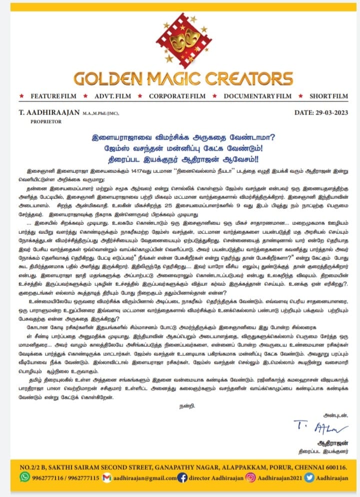 ள் சீண்டி பார்ப்பதை அனுமதிக்க முடியாது. இந்தியாவின் ஆகப்பெறும் அடையாளத்தை, விருதுகளுக்கெல்லாம் பெருமை சேர்த்த ஒரு மாமனிதரை… அவர் வாழும் காலத்திலேயே அசிங்கப்படுத்த நினைப்பவர்களை, என்னைப் போன்ற அவருடைய உண்மையான ரசிகர்கள் வேடிக்கை பார்த்துக் கொண்டிருக்க மாட்டார்கள். ஜேம்ஸ் வசந்தன் உடனடியாக பகிரங்கமாக மன்னிப்பு கேட்க வேண்டும். அவதூறு பரப்பும் வீடியோவை நீக்க வேண்டும். இல்லாவிட்டால் இளையராஜா ரசிகர்கள், ஜேம்ஸ் வசந்தன் செல்லும் இடமெல்லாம் கூடிநின்று வசைமாரி பொழியும் சூழ்நிலை உருவாகும்.