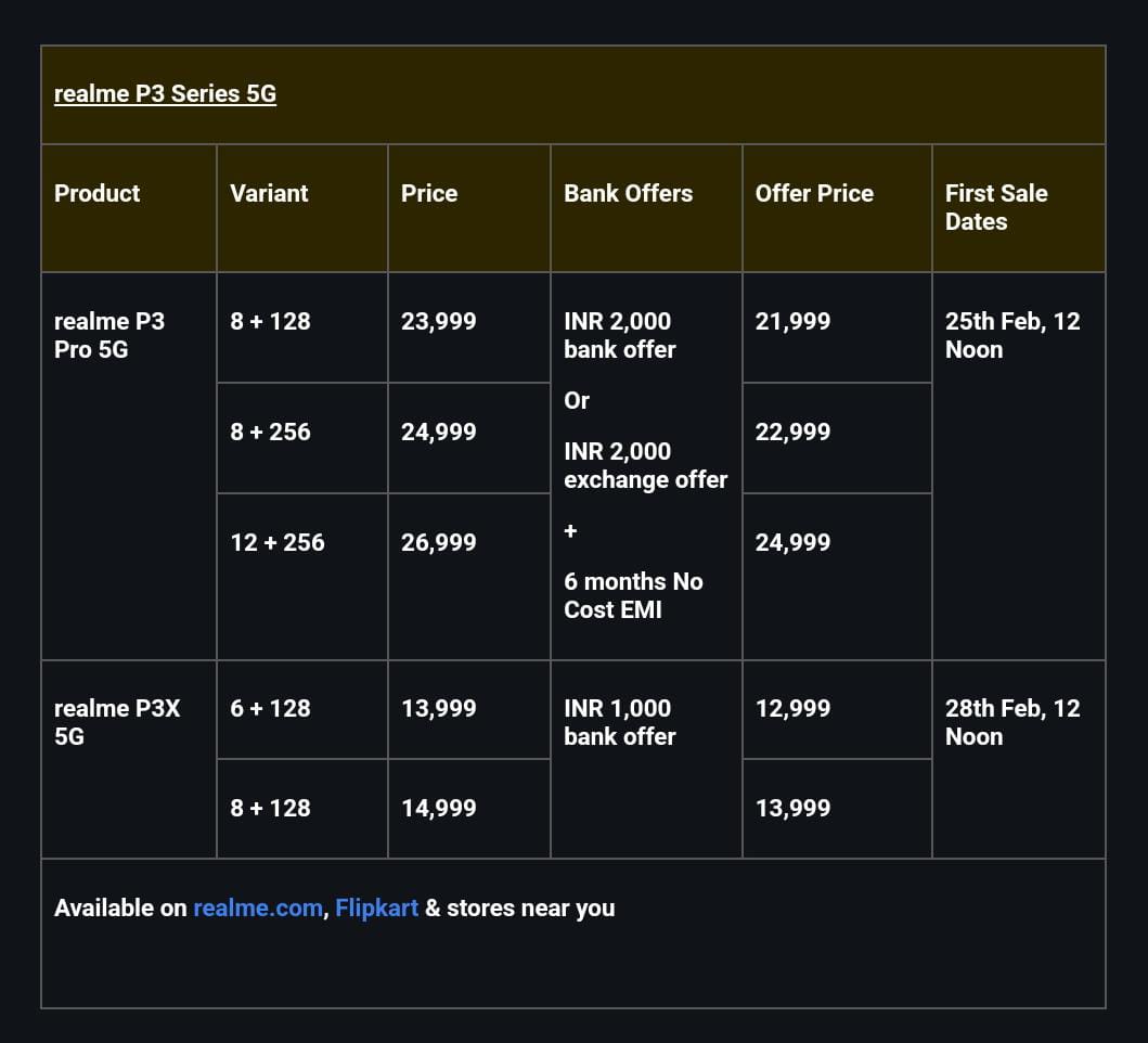 - The first sale for the realme P3 Pro 5G and realme P3x 5G is scheduled on 25th February, 12 Noon and 28th February 12 Noon onwards respectively. The smartphone will be available on Flipkart.in , realme.com & stores near you