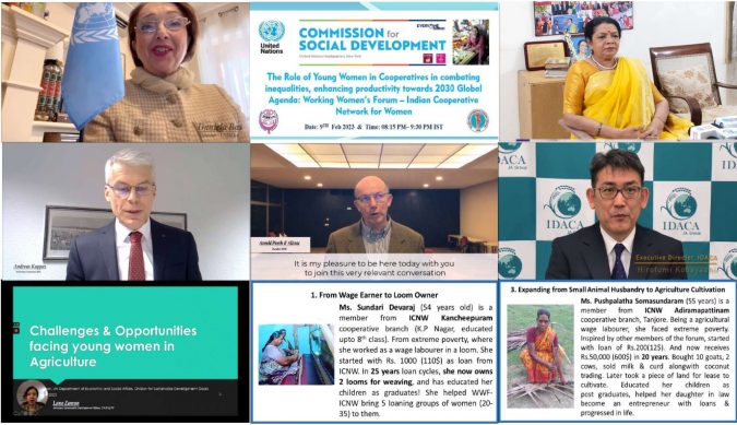 Chennai, 09 Feb 2023: The Working Women’s Forum/Indian Cooperative Network for Women” (Chennai, H.Q.): The Working Women’s Forum (WWF) – Indian Cooperative Network for Women (ICNW), has been “the only cooperative worldwide to receive the honour to conduct a side event at the 61st session of the United Nations Commission for Social Development (UNCSocD 61) on 9th Feb 2023 at 8.15 to 9.30 pm IST from Chennai H.Q. The side event is entitled “The role of Young Women in Cooperatives in combating inequalities, enhancing productivity towards 2030 Global agenda”.