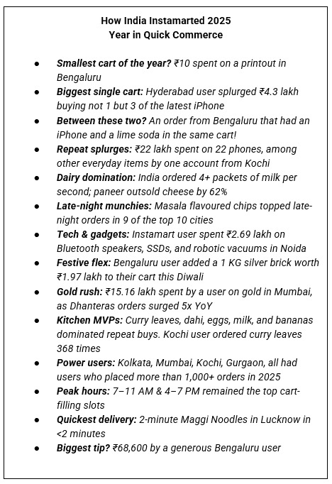 - Instamart’s top spender clocked ₹22 lakh in 2025, ordering everything from phones and air fryers to bananas and mints on the quick commerce platform