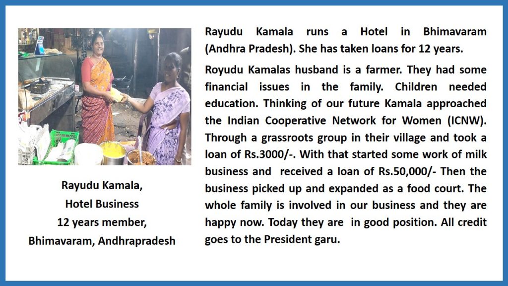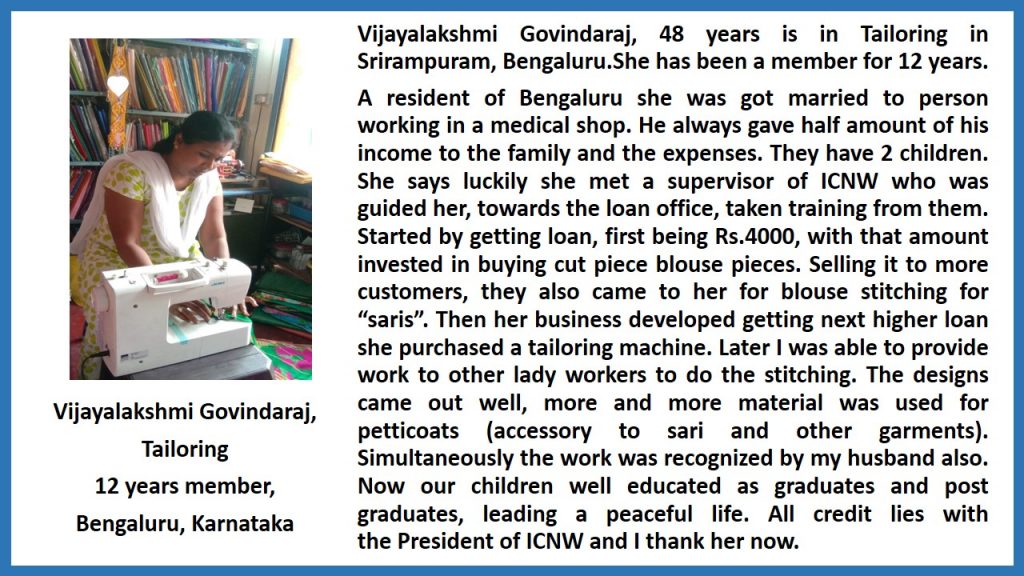 Micro entrepreneurs, who have taken subsequent loans from ICNW-WWF, increased employment, moved from informal to pre-formal sector, educated their children, empowered and involved in the WWF/ICNW women based activity). 9 awardees provided case studies from South India and their acceptance speech.