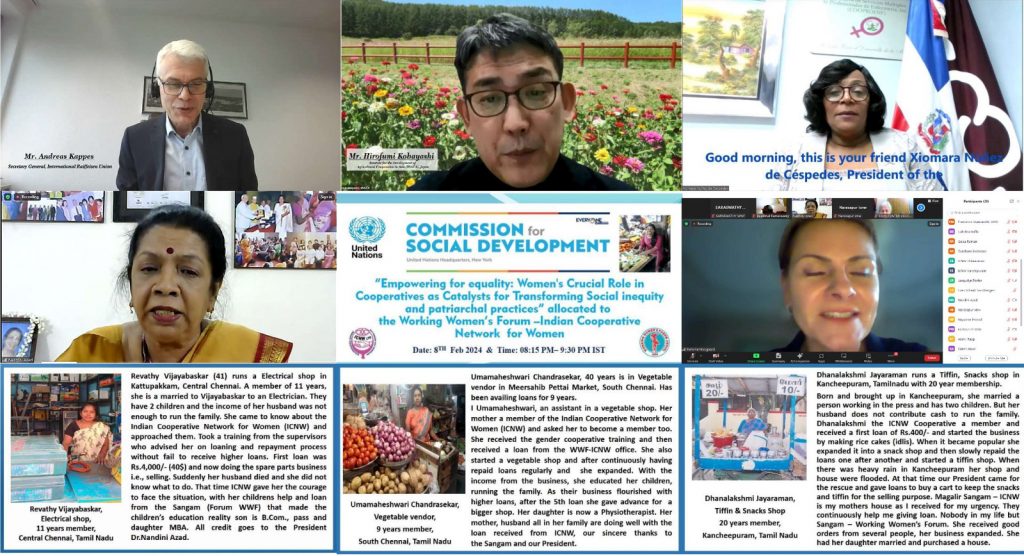 The UNCSOD 62 event entitled: “Empowering for equality: Women’s Crucial Role in Cooperatives as Catalysts for Transforming Social inequity and patriarchal practices” allocated to the Working Women’s Forum –Indian Cooperative Network for Women”