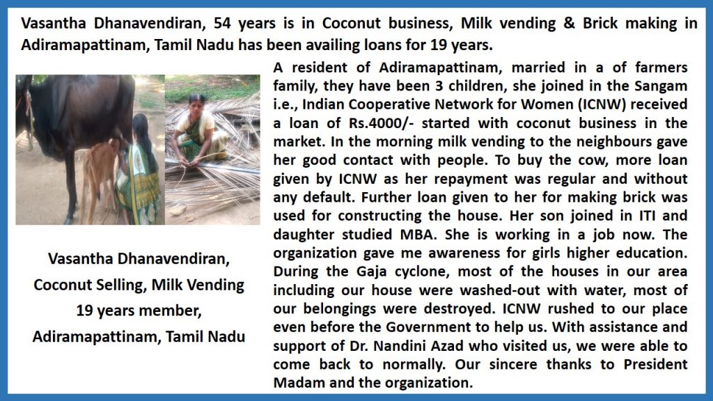 - Ms. Vasantha Dhanavendran, Coconut business, Milk vendor, Adiramapattinam, T.N.