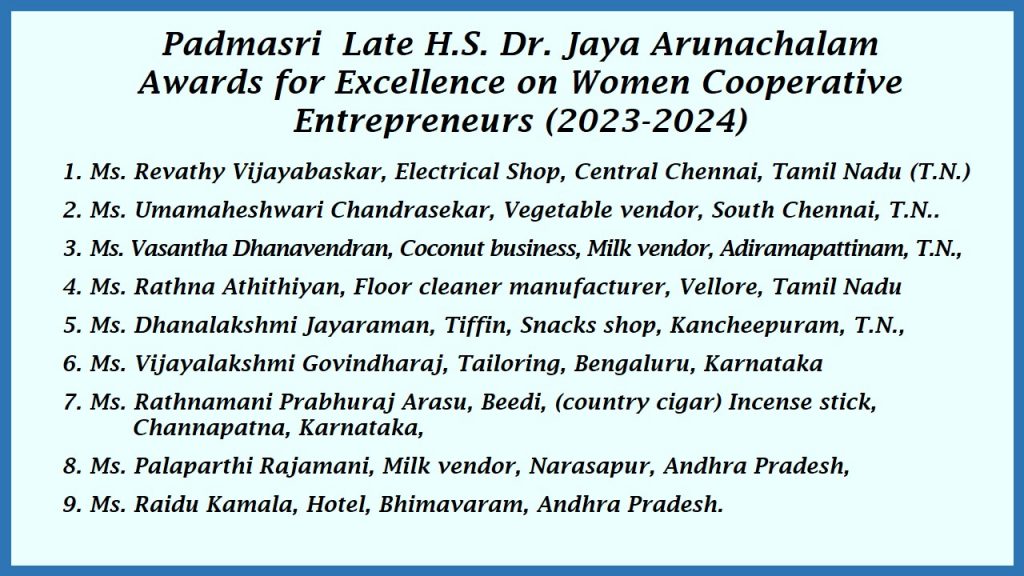 Founders Day Awards – Jaya Arunachalam Awards for Excellence amongst Women Entrepreneurs in Cooperative.