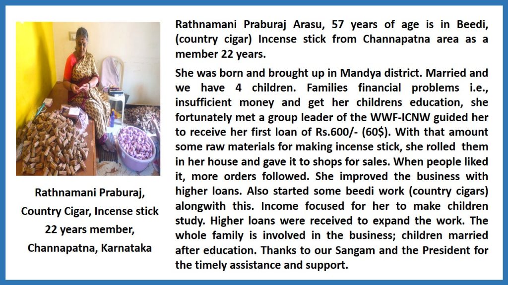 - Ms. Rathnamani Prabhuraj Arasu, Beedi, (country cigar) Incense stick, Channapatna, Karnataka,