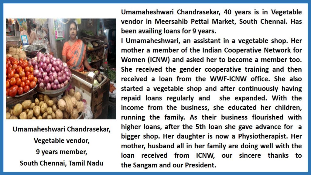 - Ms. Umamaheshwari Chandrasekar, Vegetable vendor, South Chennai, T.N.