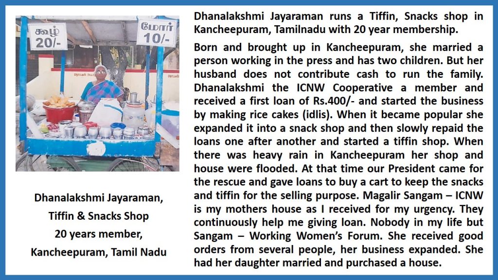 - Ms. Dhanalakshmi Jayaraman, Tiffin, Snacks shop, Kancheepuram, T.N.,